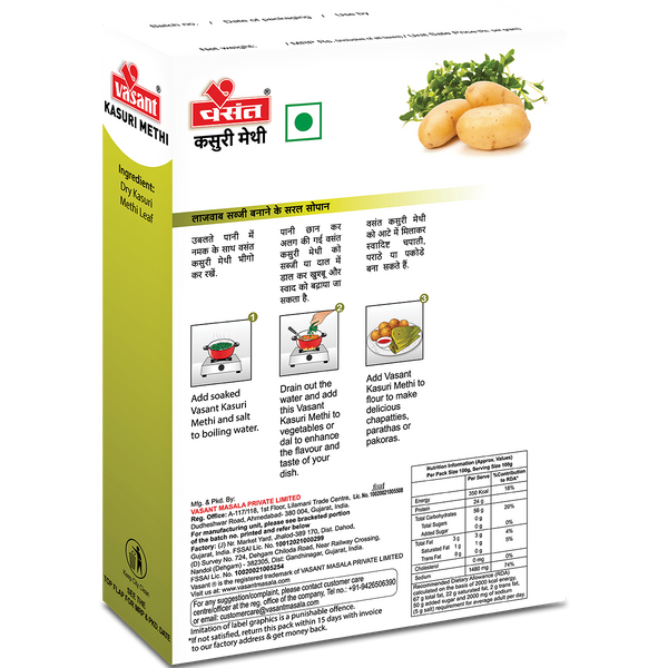 Vasant Kasuri Methi has a distinctive taste and use. It gives a delicious taste to aloo ki sabji, toor daal, methi khakhra, bhajiya, pakode, and many Punjabi dishes. Since it goes through a stringent process of cleaning in our state-of-the-art milling plant to keep it dust-free and maintain its freshness, Vasant Kasuri Methi is a preferred choice among consumers, restaurants, and the namkeen industry.