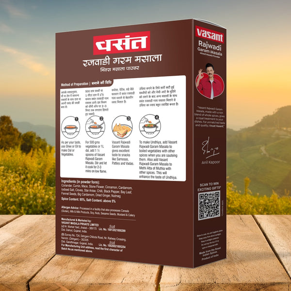 A rich blend of whole spices, Vasant Rajwadi Garam Masala is 100% pure in both colour and flavour. Add a dash of it in your curries, samosas, patra, bhakharwadi, usal, kathol, undhiyu, etc. and enrich their taste.